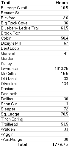 Unfortunately, the project got off to a bumpy start, with two crew members leaving in the first weeks. After the delay of recruiting a (single) replacement, work resumed with excellent quality and quantity, especially considering the scarcity of rock at the work site. But just as we reached peak productivity, two more crew members quit, and the work came to a full stop. These problems resulted in a 40% loss of crew time, and only about half of the expected work was completed. Why did these problems occur? Probably because of inadequate Trails Committee participation in the crew recruiting, selection, and intake process. As a result, the crew members were less prepared for our demanding back-country project, and not fully aware of the critical role each would play in our trails program. Where do we go from here? Except for this year, SCA volunteers have been an excellent source of trail crew members. Of our previous twenty regular crew members, the WODC suffered only one early departure. We believe we can continue this success (within the model of a co-op crew) by restoring our previous involvement in crew affairs. FundingOf the $20k trails budget, approximately $12k has been expended, primarily for expenses related to the trail crew. The US Forest Service has also pledged $4k towards this year’s work, leaving the WODC with a final trails expenditure of $8k. When you consider the 1800 hours of essential trail work that was completed, it’s a great deal for everyone. It’s also important to remember that 75% of the work was done by volunteers. Only the crew leader was compensated for his time, but we still owe Jeff the biggest "Thank You" for his tireless devotion to the summer crew. Safety NotesSafety is always a top-priority for trail work, and the WODC has been fortunate that our only accident in the last ten years involved a knife cut at lunch time! Since most WODC trails are within the Sandwich Range Wilderness, motorized equipment is prohibited, and all work must be done with hand tools. (You’d be surprised what you can do with a $12 bow saw!) While the Forest Service does allow chain saws outside Wilderness, they can only be used by those with formal FS training and certification. For your own safety (and to preserve the accident protection afforded to FS volunteers), please leave your chain saw at home! If you do encounter something too big for a hand saw, give the Trails Committee a call. The Forest Service will also be glad to send out a certified sawyer for the occasional non-Wilderness blow-down.